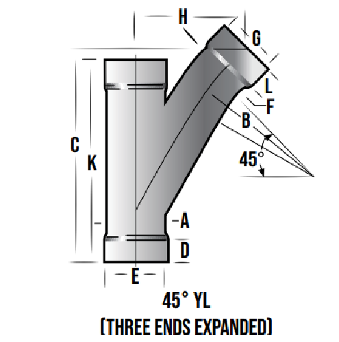 Industrial vacuum tubing fittings 45 degree YL Combo’s are available with standard expanded ends through 6 inch diameter. YL-2151-Z is the part number for a standard Industrial vacuum tubing fittings 45 degree YL Combo in a two and one eighth inch size with expanded ends. YL-2151-ZS is the part number for an Industrial vacuum tubing fittings 45 degree YL Combo in a two and one eighth inch size with straight ends.